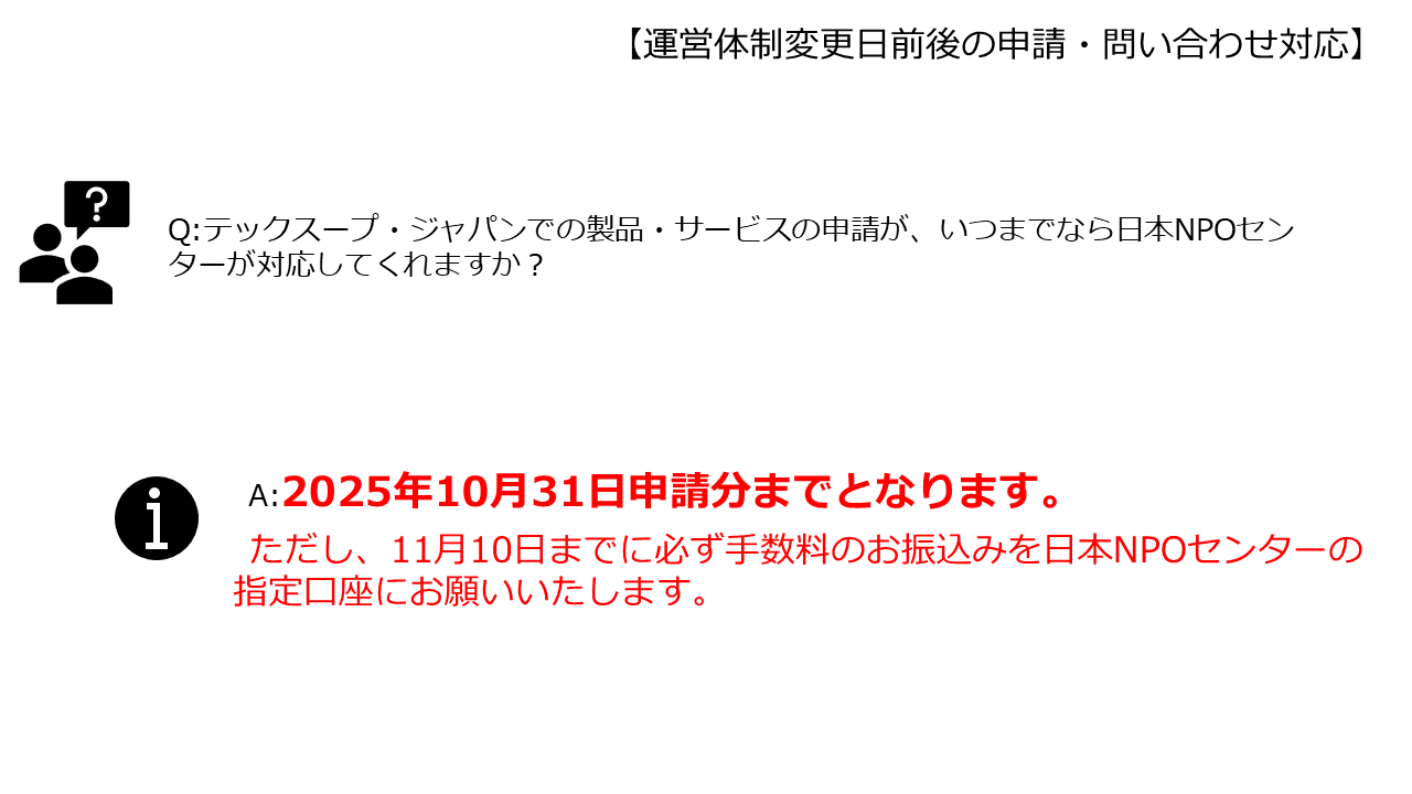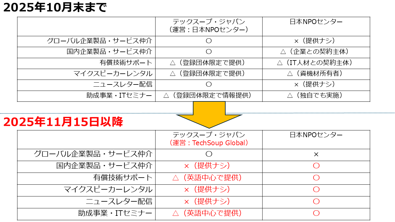 2025年11月15日(土)付けで、日本NPOセンターが担っているテックスープ・ジャパンプログラムの運営を、TechSoup Global(テックスープ米国本部)に統合することが決まりました。また、同日付で日本NPOセンターは、テックスープ・ジャパンプログラムの運営から離れることになりました。